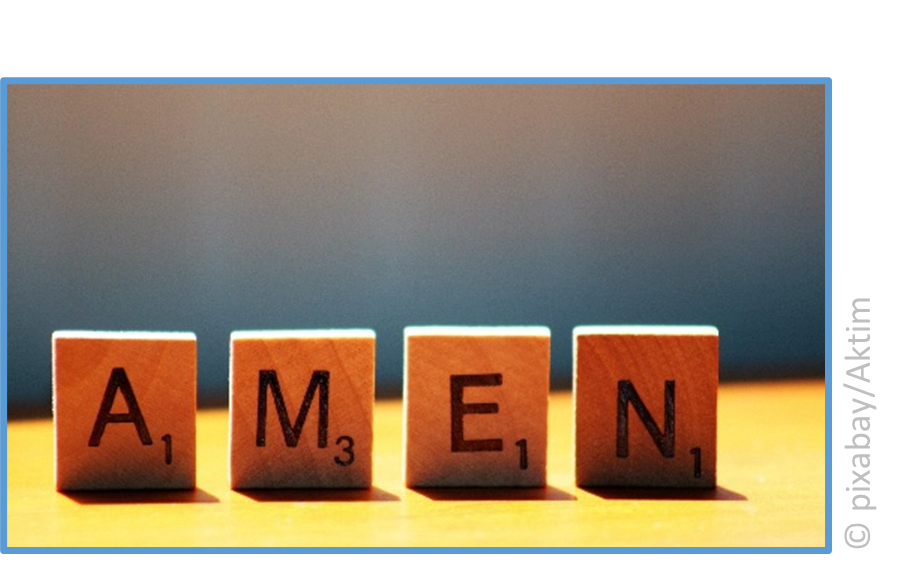 Wer sich jetzt gedacht hat, dass unsere Serie mit „ewiges Leben“ schon vorbei ist, der könnte einmal die Bibel ganz am Ende aufschlagen und nachlesen, mit welchem wichtigen Wort die Heilige Schrift abschließt. Es ist das Wort „Amen“, ein Wort, das aus dem Hebräischen kommt. In seiner Grundbedeutung meint es das Gleiche wie „glauben“, nämlich „fest stehen, verlässlich und treu“.