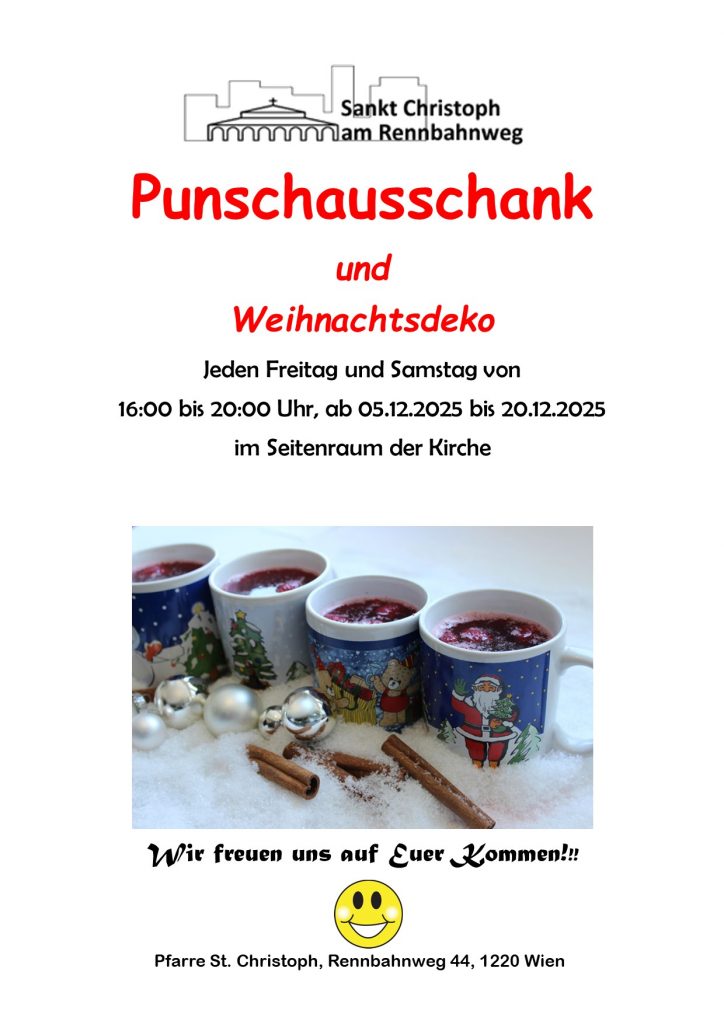 Unsere traditionellen und gern besuchten Punschabende finden dieses Jahr Freitag und Samstag Abend statt! Zum leiblichen Wohl gibt es gut sortierten Weihnachtsschmuck gegen Spende zu kaufen.